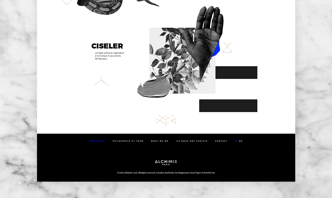 The agency Alchimie has trusted me for many years to build their visual identity and decided this year to reposition its graphic territory. I have developed surrealist black and white collages, a range of golden graphic patterns with touches of Klein blue for more premium and upscale positioning. The printing of the stationery was particularly neat with a hot stamping and debossing on the logo. The website, developed to measure, made it possible to highlight the collages thanks to effects of depth, in parallax.
