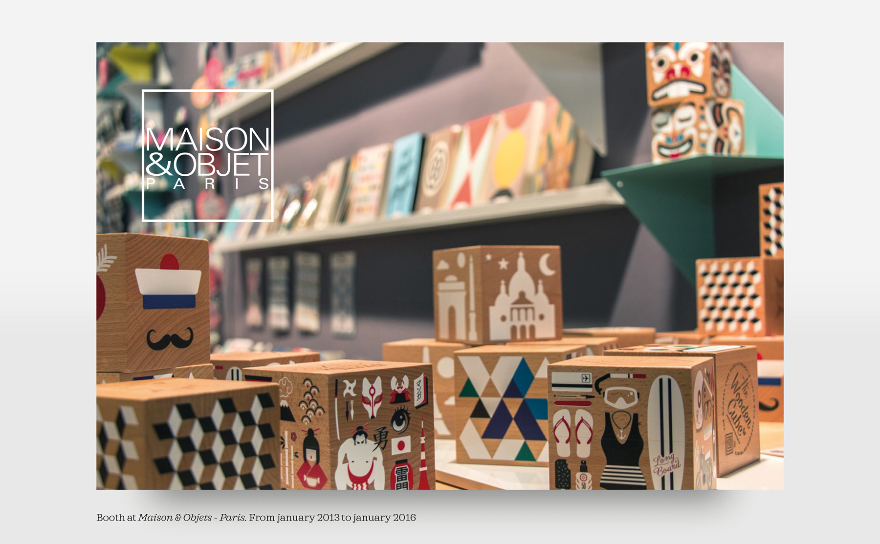 The packaging is screenprinted in white. The Wooden Cube is available in 14 original graphic themes.